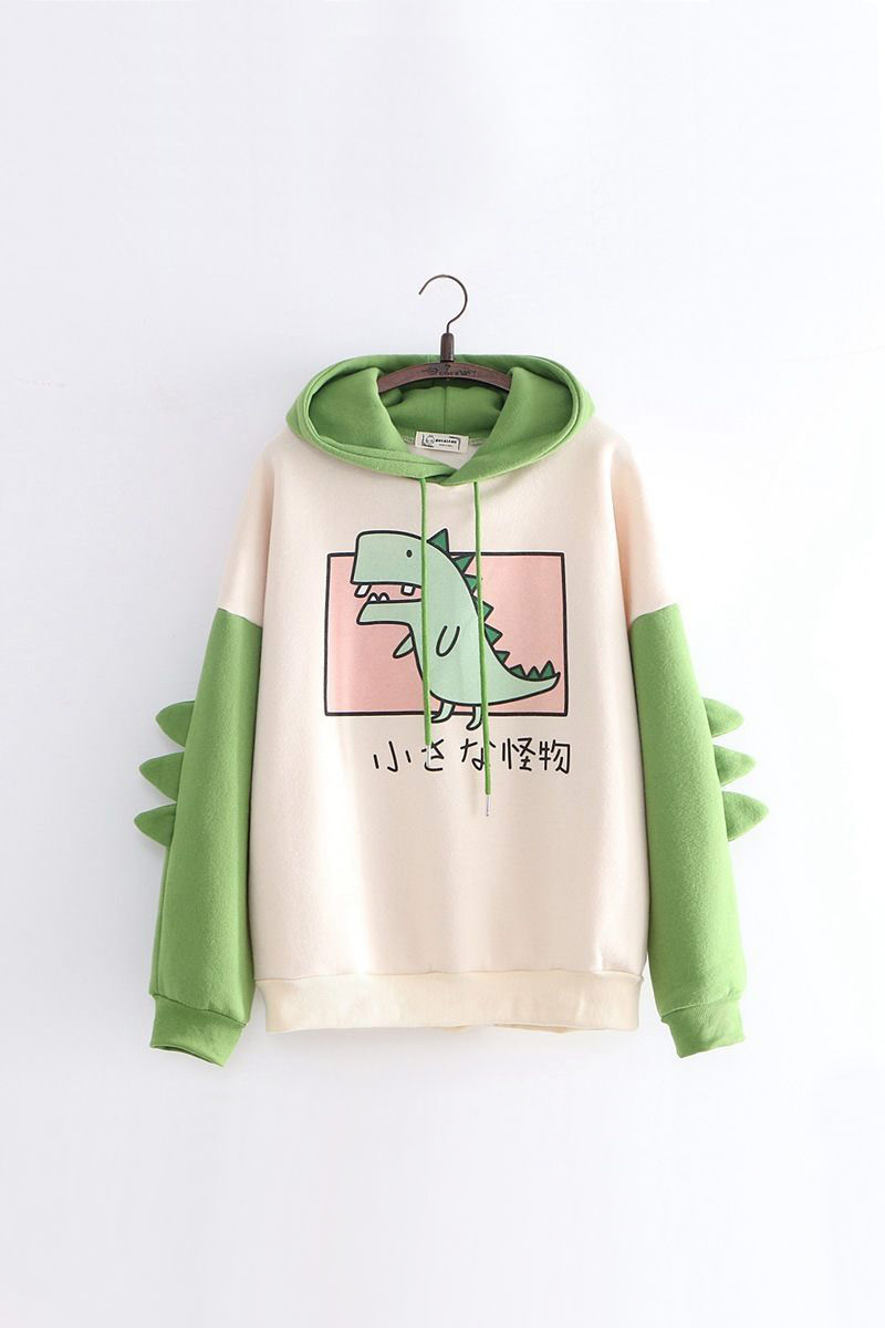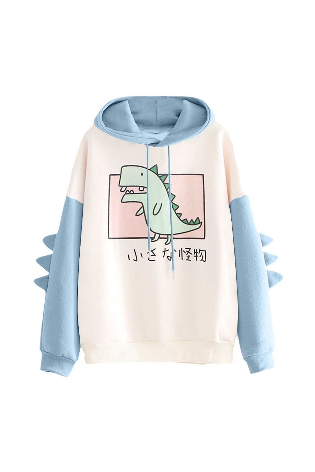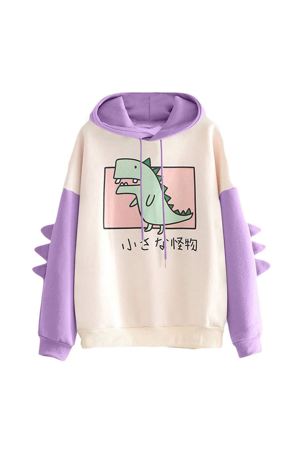 Очаровательное Бежевое с Розовым Худи — Свитшот с Капюшоном и Рожками-Шипами «Дракон / Годзилла / Динозавр» с надписью на японском «Маленький Монстр» в нежном комфетном оттенке.